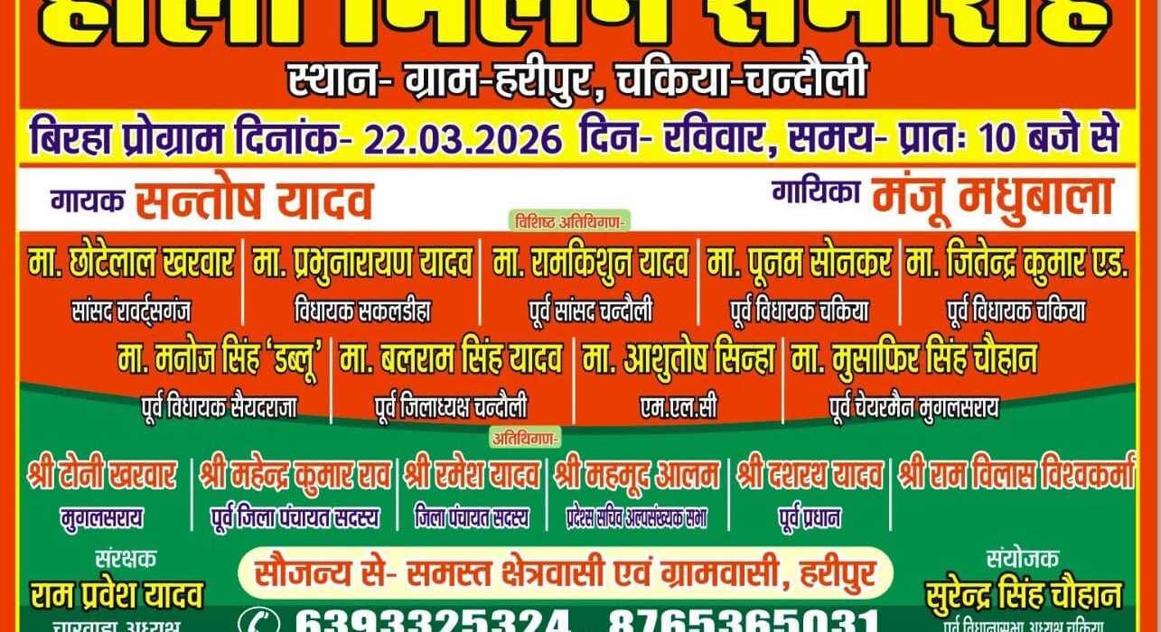 चकिया (चंदौली)। चकिया क्षेत्र के हरिपुर गांव में आगामी 22 मार्च 2026 (रविवार) को भव्य होली मिलन समारोह एवं बिरहा कार्यक्रम का आयोजन किया जाएगा। कार्यक्रम का शुभारंभ प्रातः 10 बजे से होगा। इस आयोजन में क्षेत्र के जनप्रतिनिधि, सामाजिक कार्यकर्ता तथा बड़ी संख्या में ग्रामीणों की भागीदारी रहने की उम्मीद है। आयोजन को लेकर गांव सहित आसपास के क्षेत्रों में उत्साह का माहौल है।