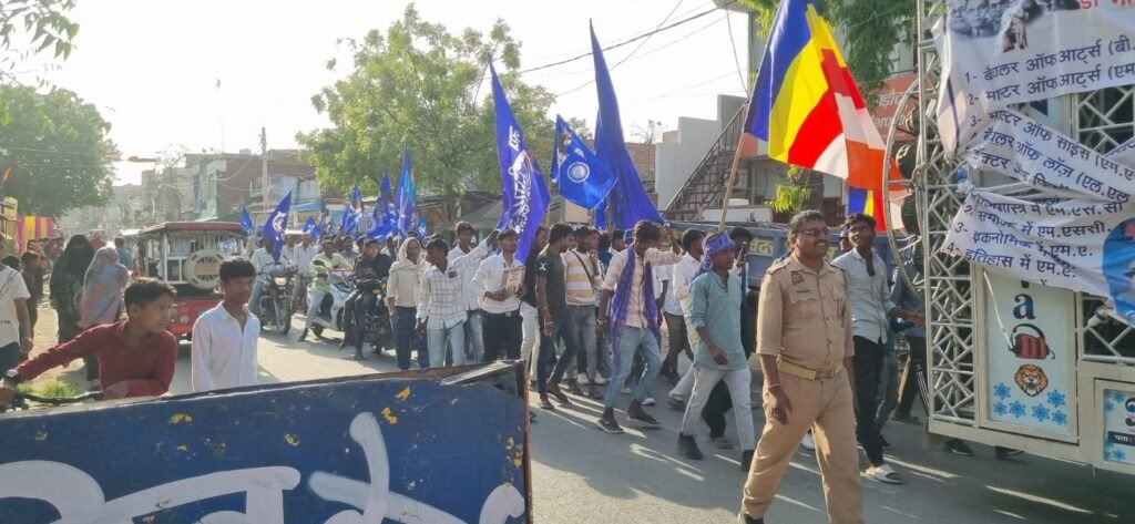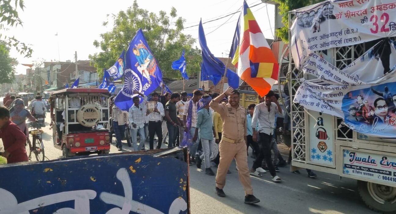 जुलूस की शुरुआत क्षेत्र के विभिन्न गांवों से हुई, जो सैदूपुर, बरहुआ और गांधीनगर होते हुए कोदवरिया बेलावर स्थित अंबेडकर पार्क पहुंचा। पूरे मार्ग में “जय भीम” और “बाबा साहेब अमर रहें” जैसे नारों से वातावरण गूंजता रहा। लोगों के हाथों में बाबा साहेब की तस्वीरें और नीले झंडे लहराते नजर आए, जिससे माहौल पूरी तरह उत्सवमय हो गया।