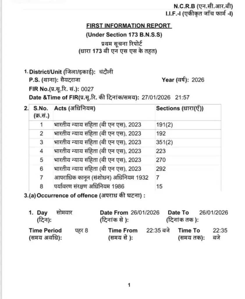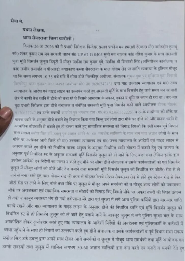 सैयदराजा कस्बे में सरस्वती प्रतिमा विसर्जन के दौरान डीजे की तेज आवाज और तय रूट से हटकर जुलूस ले जाने को लेकर हुए विवाद में पुलिस ने सख्त कार्रवाई करते हुए समाजवादी पार्टी के पूर्व विधायक मनोज कुमार सिंह ‘डब्लू’ समेत चार नामजद और दर्जनों अज्ञात लोगों के खिलाफ मुकदमा दर्ज किया है। पुलिस ने शांति भंग करने सहित आठ गंभीर धाराओं में केस पंजीकृत कर विवेचना शुरू कर दी है।