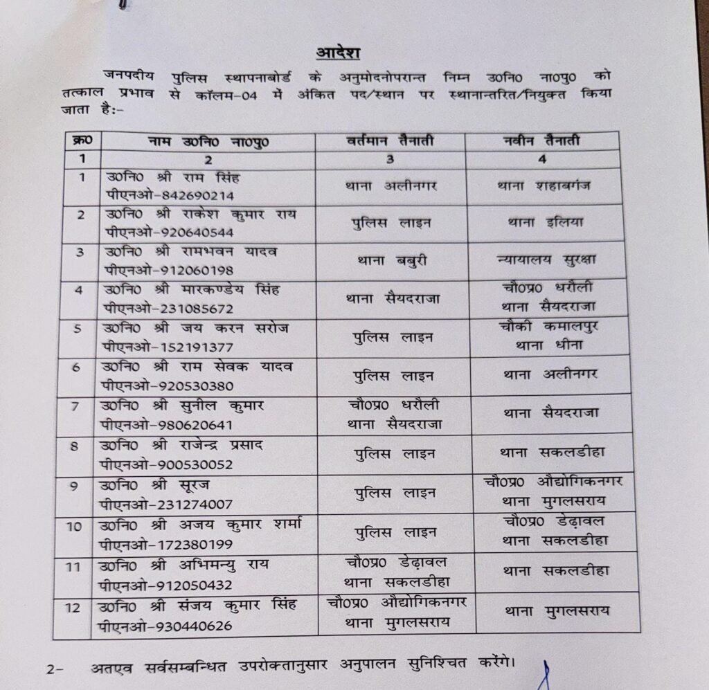 चंदौली पुलिस विभाग में बड़ा फेरबदल: एक दर्जन उपनिरीक्षक का स्थानांतरण, कई थानों के बदले प्रभारी
