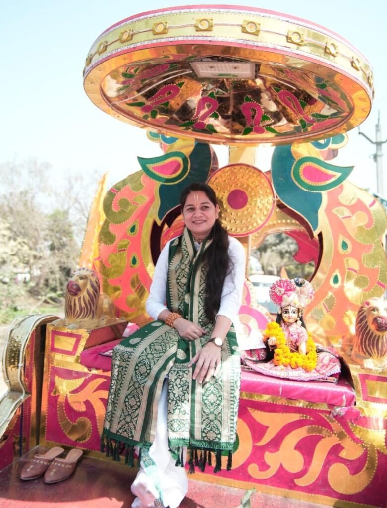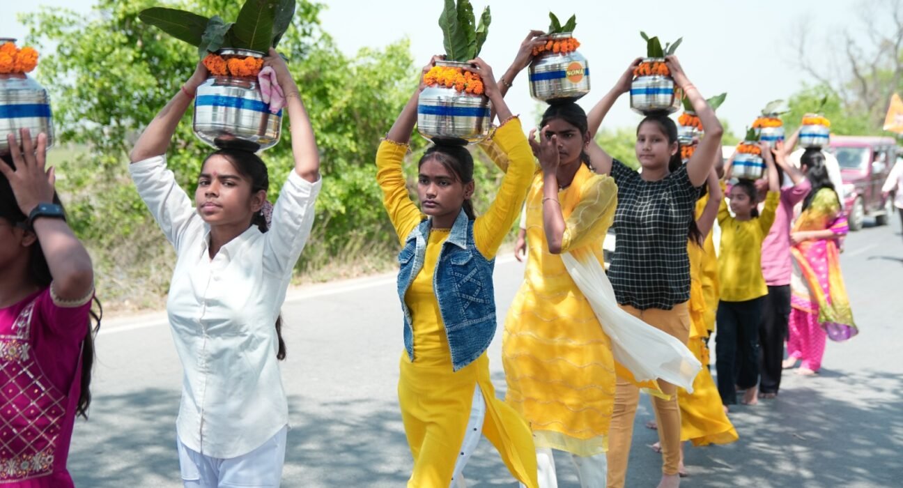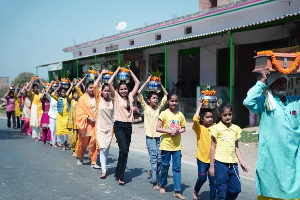 21 कलशों के साथ निकली शोभायात्रा, जगह-जगह पुष्प वर्षा कर ग्रामीणों ने किया स्वागत