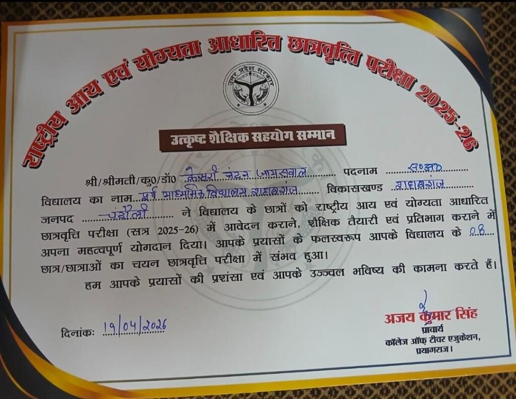 शहाबगंज, चंदौली। पूर्व माध्यमिक विद्यालय शहाबगंज के शिक्षक केशरी नंदन जायसवाल ने अपने उत्कृष्ट शैक्षिक योगदान से एक बार फिर जिले का नाम रोशन किया है। उनके मार्गदर्शन में पढ़ने वाले 8 छात्रों ने राष्ट्रीय आय एवं योग्यता आधारित छात्रवृत्ति परीक्षा (एनएमएमएस) में सफलता हासिल की, जिसके लिए उन्हें राजधानी लखनऊ में आयोजित एक भव्य समारोह में सम्मानित किया गया।आज