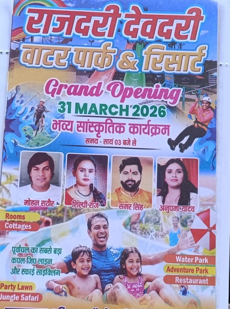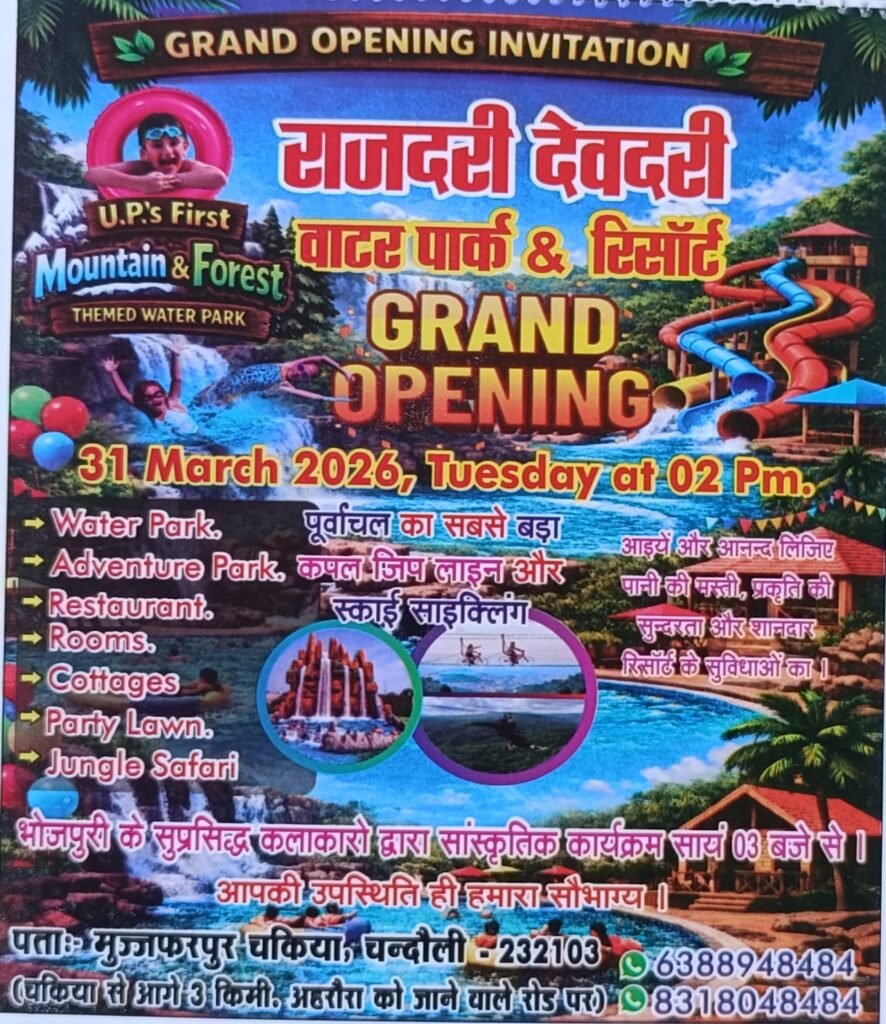 चकिया (चंदौली): जनपद चंदौली के पर्यटन क्षेत्र में एक और नया अध्याय जुड़ने जा रहा है। प्राकृतिक सौंदर्य से भरपूर चकिया क्षेत्र में स्थित राजदरी देवदरी वाटर पार्क & रिसॉर्ट का भव्य उद्घाटन 31 मार्च 2026 (मंगलवार) को दोपहर 3 बजे से किया जाएगा। इस वाटर पार्क को खास तौर पर माउंटेन & फॉरेस्ट थीम पर विकसित किया गया है, जो इसे अन्य पार्कों से अलग और आकर्षक बनाता है।